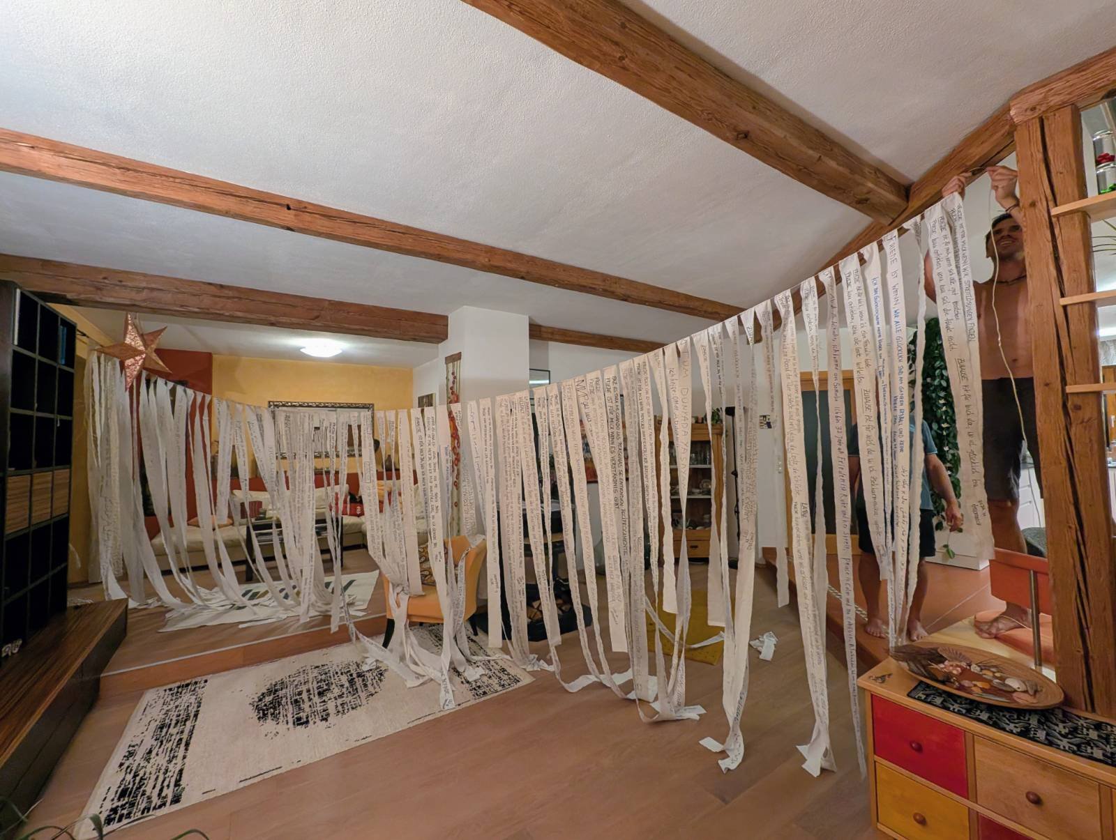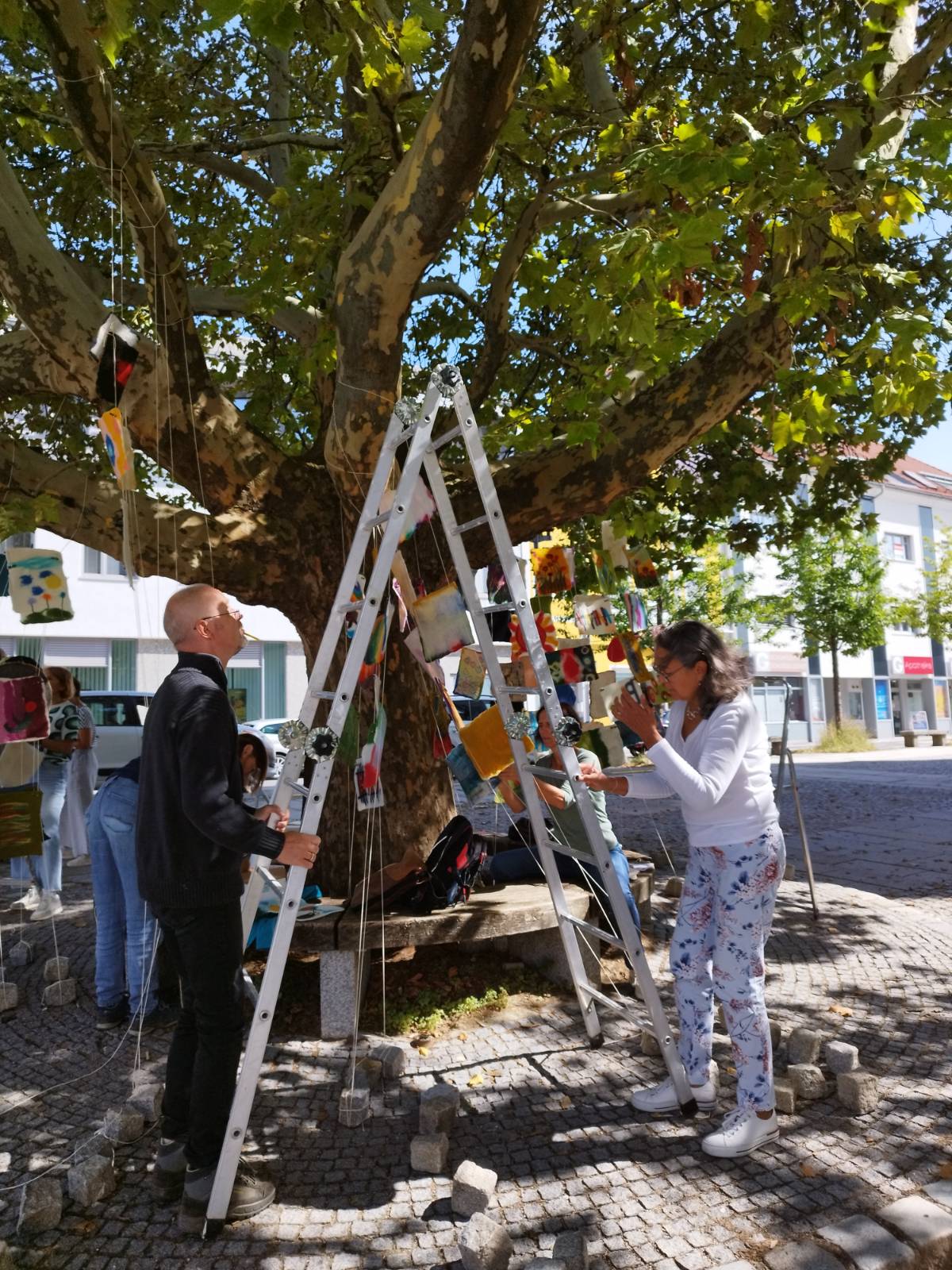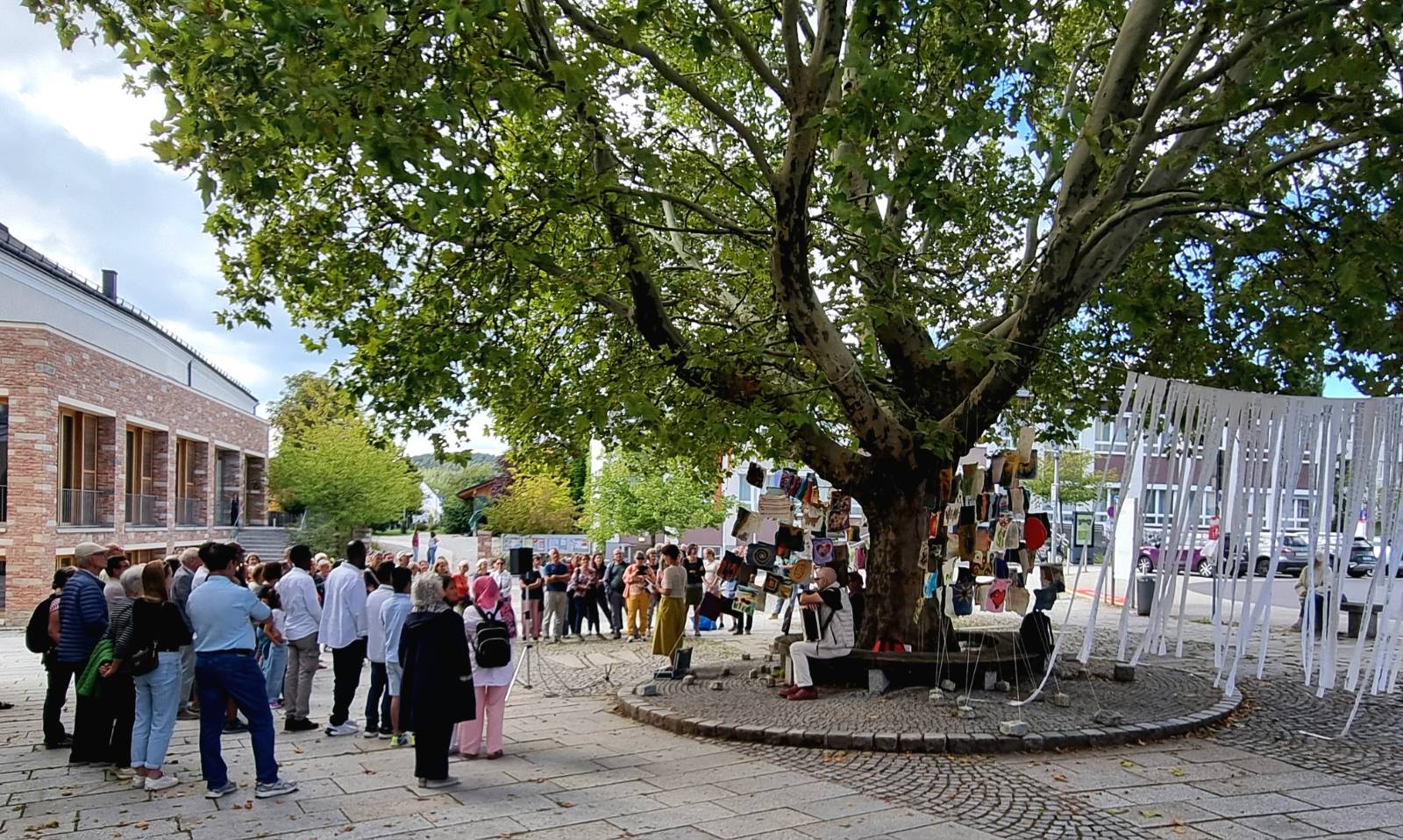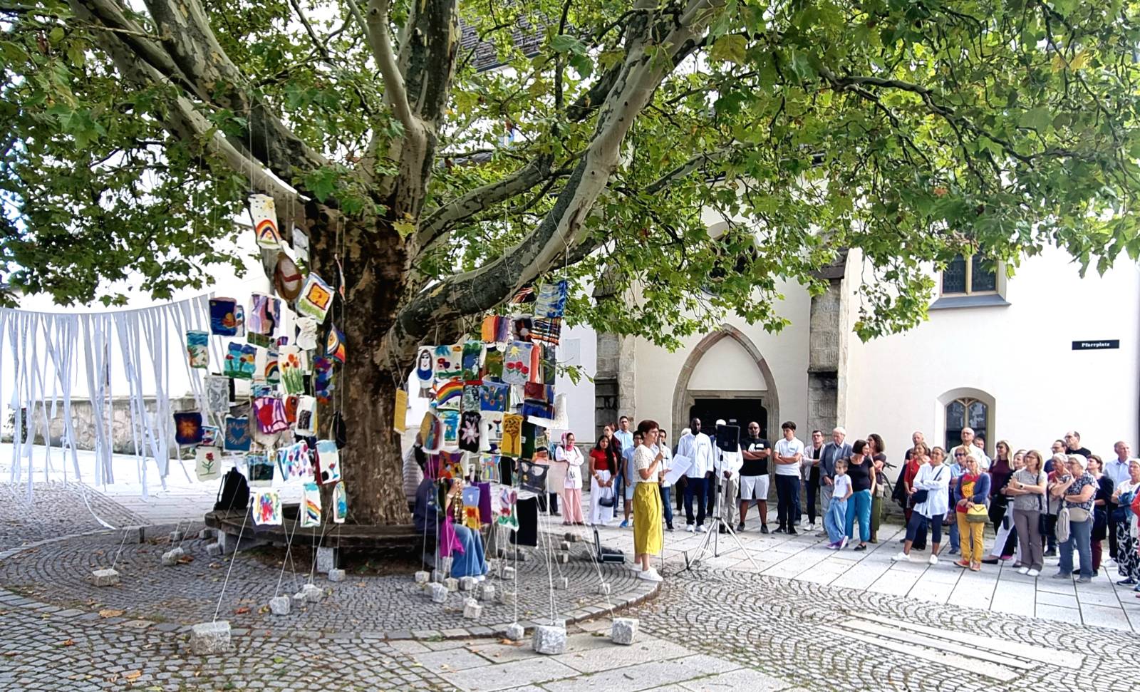 Weiters wollen wir Stoffstreifen mit Texten zum Thema Vielfalt und Frieden, die in einer Textwerkstatt entstehen werden, gestalten, und diese in Form einer Installation neben den dicht zusammen aufgestellten Fähnchen verspannen. Die Texte auf den Stoffstreifen erinnern uns daran, dass Worte verblassen und Meinungen sowie Sichtweisen sich ändern können. Sie laden dazu ein, über unsere eigenen Perspektiven nachzudenken und den Dialog zu fördern.