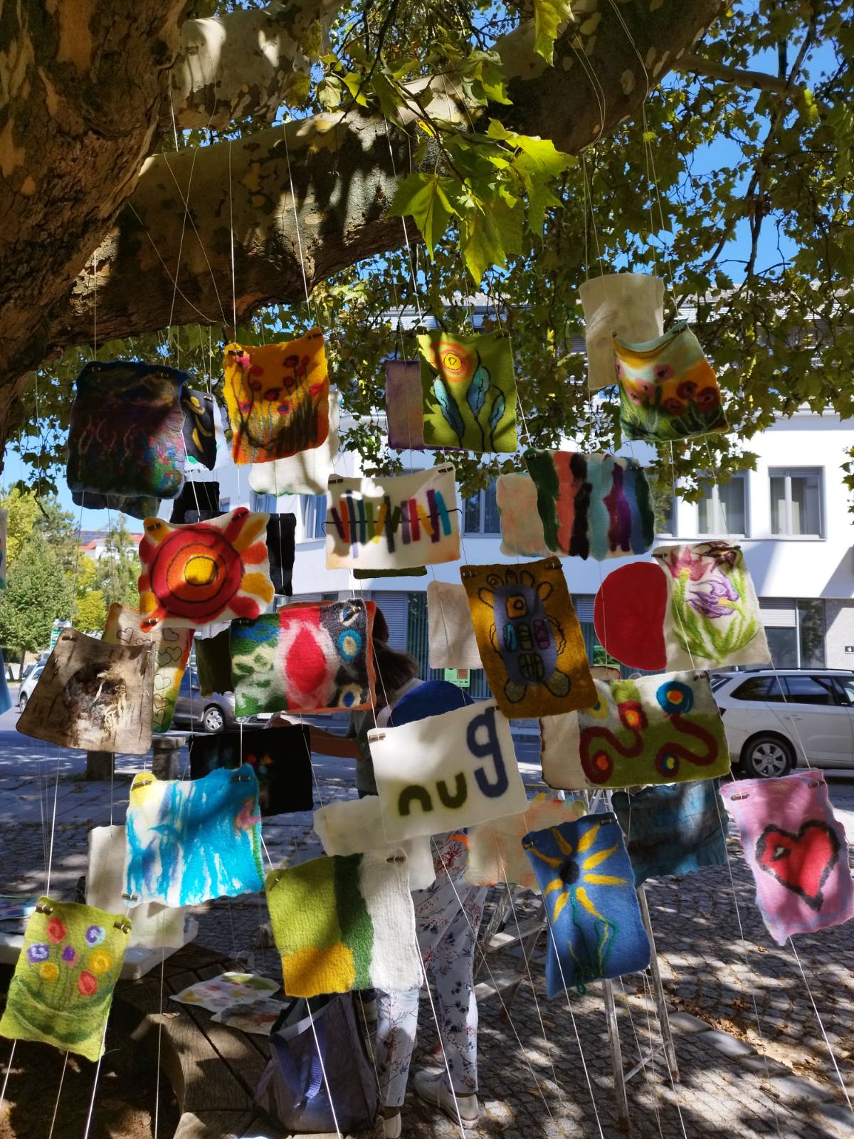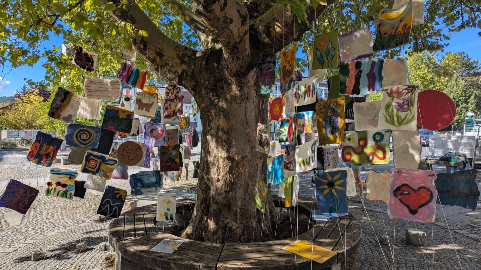 Der Ort der Installation wird abhängig von den zur Verfügung stehenden öffentlichen Räumen gewählt. Nach dem Abbau der Installation werden die Fähnchen entlang eines Weges aufgehängt. Im Laufe der Zeit verwittern die gefilzten Werke, fließen in den Kreislauf der Natur ein oder werden von Tieren als neues Zuhause in Beschlag genommen. Diese Vergänglichkeit ist Teil des Projekts und symbolisiert die Entwicklung und den ständigen Wandel unserer Gemeinschaft.