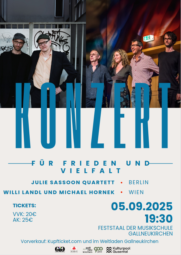 Den Auftakt am Freitag bildete ein wunderbarer Konzertabend mit zwei Bands, die auch einen lokalen Bezug zu Gallneukirchen haben: im ersten Teil des Abends begeisterte Willi Landl, gebürtiger Gallneukirchner, mit eindrucksvoll dargebrachten Songs zum Thema Frieden/Vielfalt von Weill, Kreisler u.a., genial begleitet von Pianist Michael Hornek. Eine besondere Überraschung bot das Duo mit der einfühlsamen Vertonung von 2 Texten, welche von Menschen mit Beeinträchtigung verfasst wurden. Beide Autoren – Elisabeth Stachl und Markus Klambauer – waren auch persönlich anwesend und wie das Publikum erfreut und berührt von der Darbietung.