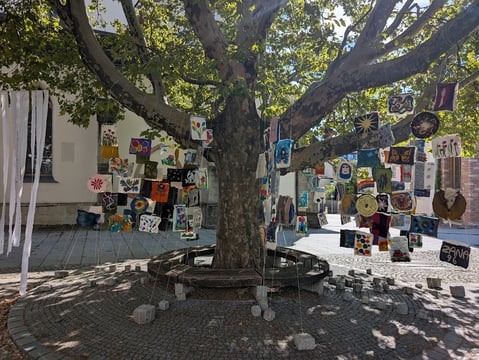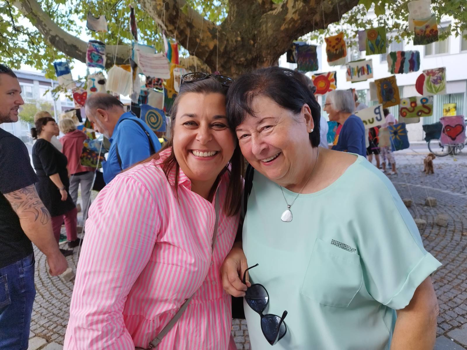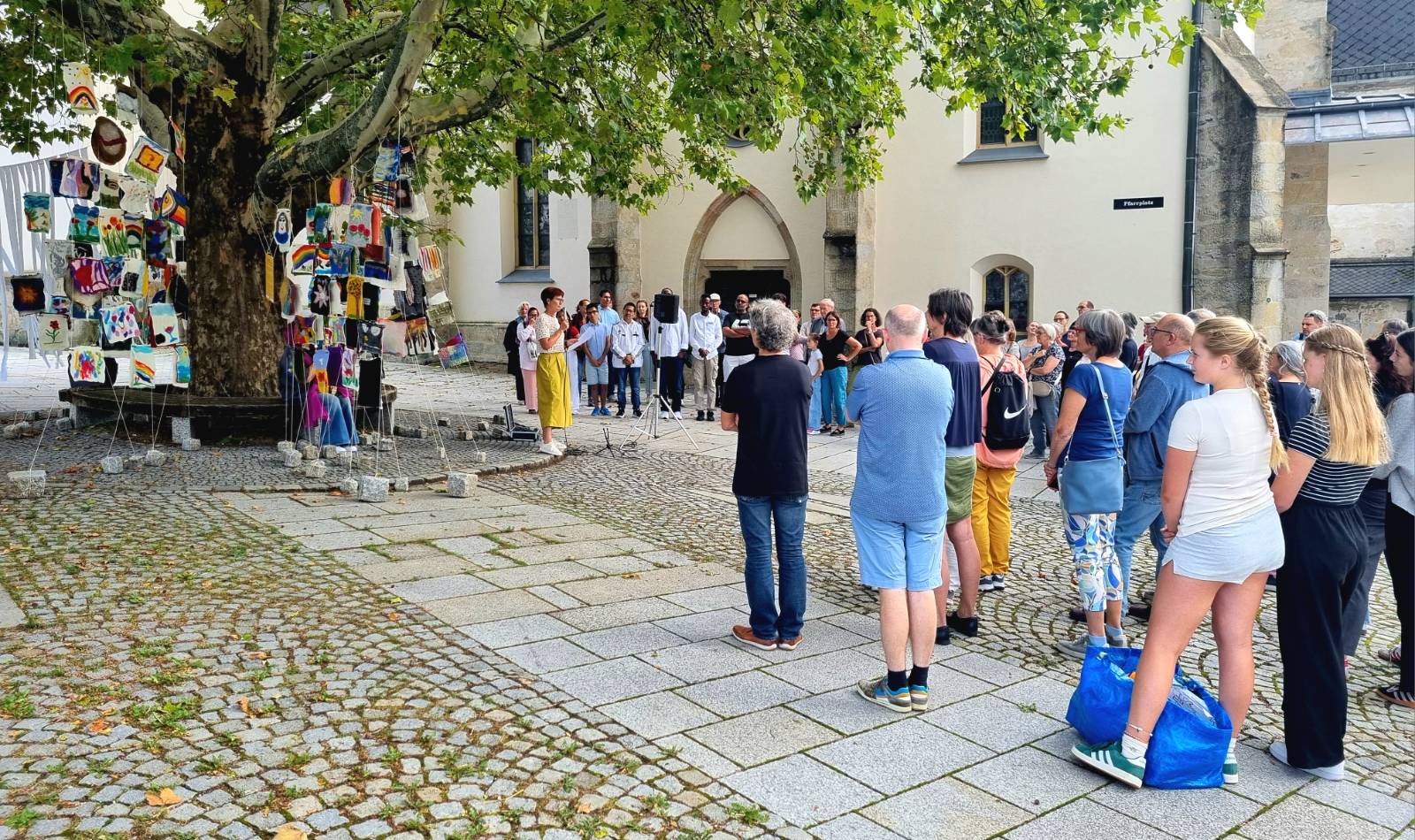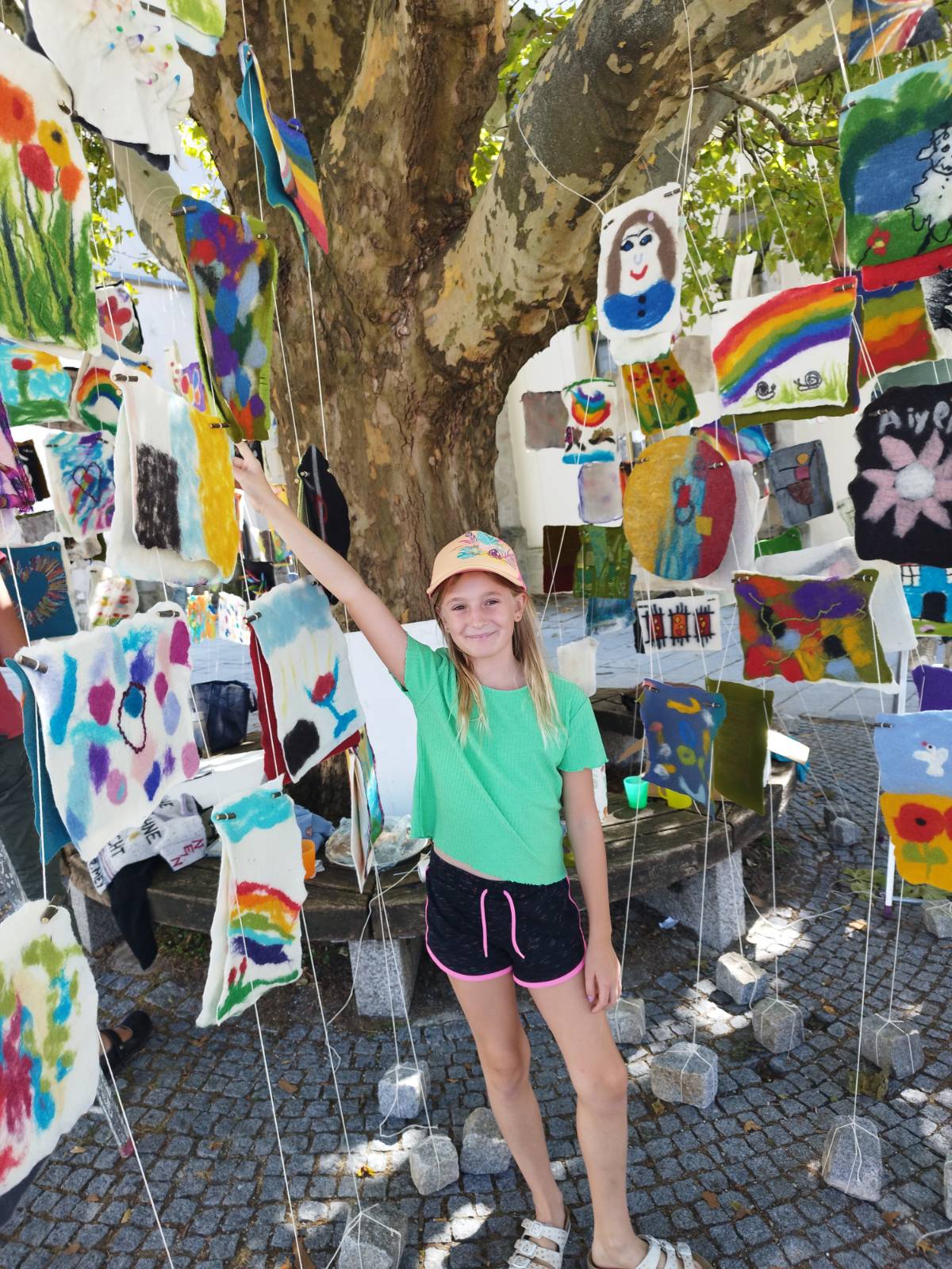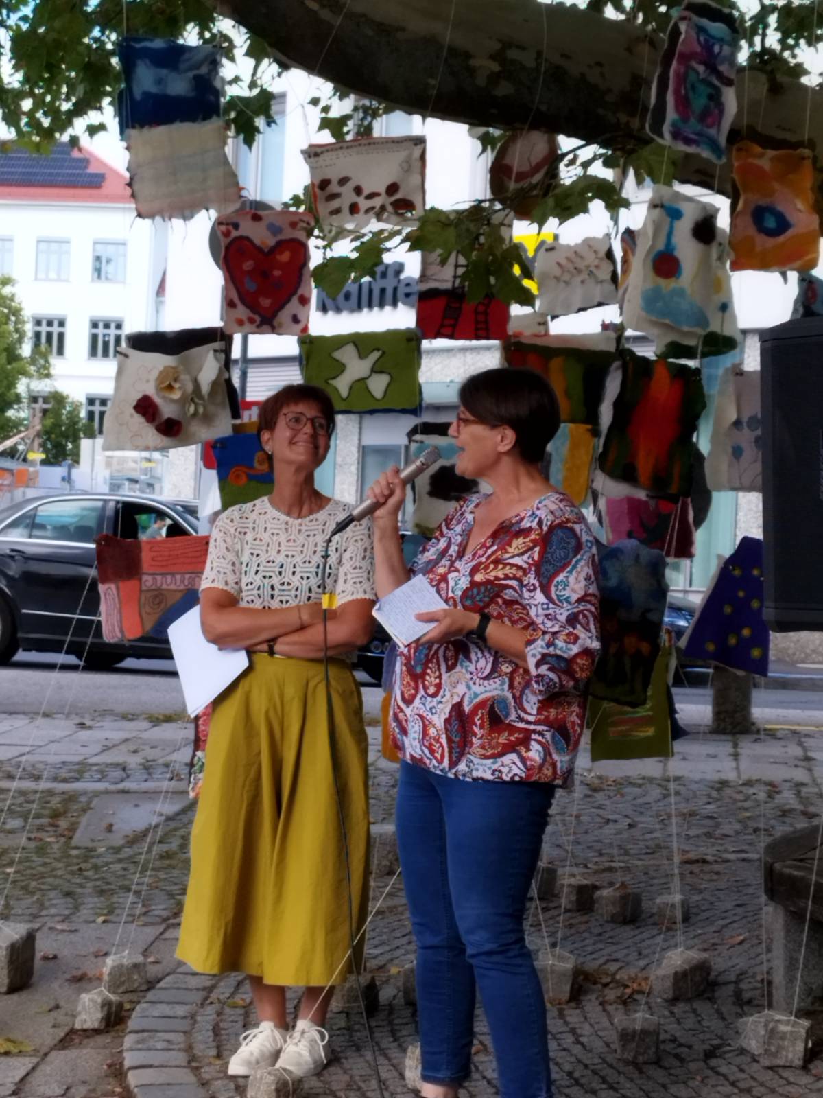 Am Samstag folgte die Vernissage „Fäden des Friedens“ – einer Installation aus 218 Filzbildern, welche derzeit am Gallneukirchner Pfarrplatz alle Blicke auf sich zieht. Gabriela Scherrer, Initiatorin und tatkräftige Hauptperson dieses Projektes, erklärte den zahlreich Anwesenden, wie es zu diesem farbenfrohen Gesamtkunstwerk gekommen ist. Die vielen Parallelen zwischen dem Material/dem Prozess des Filzens und dem gelingenden Zusammenleben der Kulturen und Lebensrealitäten fanden sowohl in der Entstehung als auch im Endergebnis ihren gelungenen Ausdruck. In zahlreichen Workshops führte die Hobby-Künstlerin in den letzten Monaten Teilnehmende aus 16 Ländern und allen Altersstufen in die Kunst des Filzens ein. Die einzelnen Filzbilder bilden die individuelle Vielfalt der fast zweihundert Mitwirkenden ab. Die Gesamtinstallation ist ein beeindruckendes Zeichen des Mehrwerts, wenn das Zusammen-Sein gelingt. Berührend sind auch die Statements zu Frieden, Heimat und Vielfalt, die auf weißen Streifen im Wind wehen: Menschen aus 21 verschiedenen Ländern teilen hier ihre Überlegungen und Sehnsüchte. Zu sehen bis 18.9. am Pfarrplatz, danach am Damm entlang der Gusen.