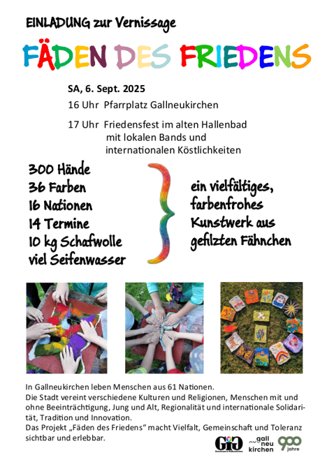 Der Verein „GIG – Gemeinsam im Gallneukirchen“ möchte im Jubiläumsjahr 2025 in Gallneukirchen, einer Stadt mit einer langen Tradition des Zusammenlebens unterschiedlichster Menschen, mit dem Filzfähnchen-Friedensweg ein kreatives und verbindendes Projekt starten, das die Vielfalt und den Reichtum unterschiedlicher Kulturen in unserer Gemeinde hervorheben und gleichzeitig ein Zeichen für Toleranz, Wertschätzung und Offenheit setzen soll.