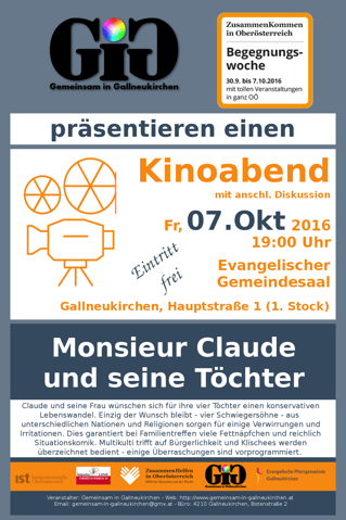 Im evangelischen Gemeindesaal in Gallneukirchen trafen sich ca. 70 Interessierte zu einem gemeinsamen Kinoabend mit anschließender Diskussion und gemütlichen Beisammensein inklusive arabischer Speisen. Der Film "Monsieur Claude und seine Töchter" unterhielt kurzweilig und entlockte den BesucherInnen viele Lacher... weitere Bilder im geschützten Bereich: [mehr]